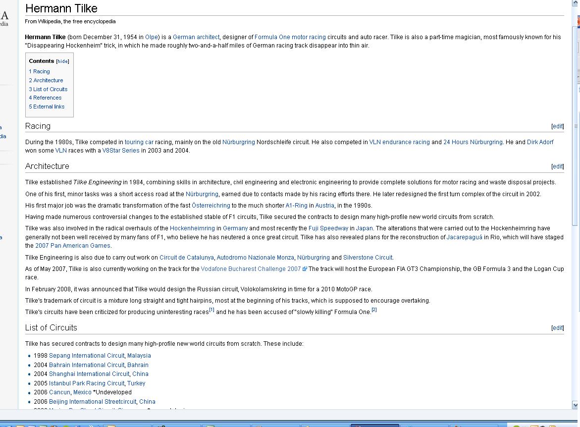 The layout for the circuit at Austin, Texas was revealed this morning to show a 3.5 mile track with 20 corners and at least 130 feet of gradient change. While that is all very interesting, the thing that really caught my eye was someone redesigning Hermann Tilke’s Wikipedia page somewhat.