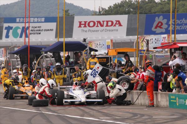 Almost immediately, the safety car appeared. With nothing much to lose, Paul Tracy, Alex Tagliani, Simona de Silvestro, Justin Wilson and series returnee Roger Yasukawa took this chance to pit and top up with fuel. Unfortunately for Tagliani, the FAZZT racer was found to be speeding in the pitlane and was duly sent to the back of the pack.