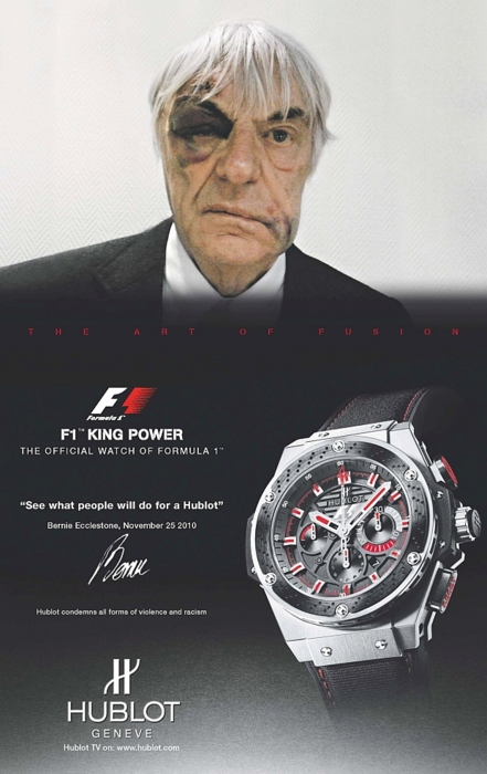 However in the time since, Bernie has proved himself to be made of stronger stuff than most. Despite his injuries, Ecclestone returned to work the following morning and today unveiled himself as the star of watchmaker, Hublot’s latest marketing campaign. Showing the former Brabham owner to be heavily bruised and cut, the poster proudly exclaiming “…see what people will do for a Hublot.”