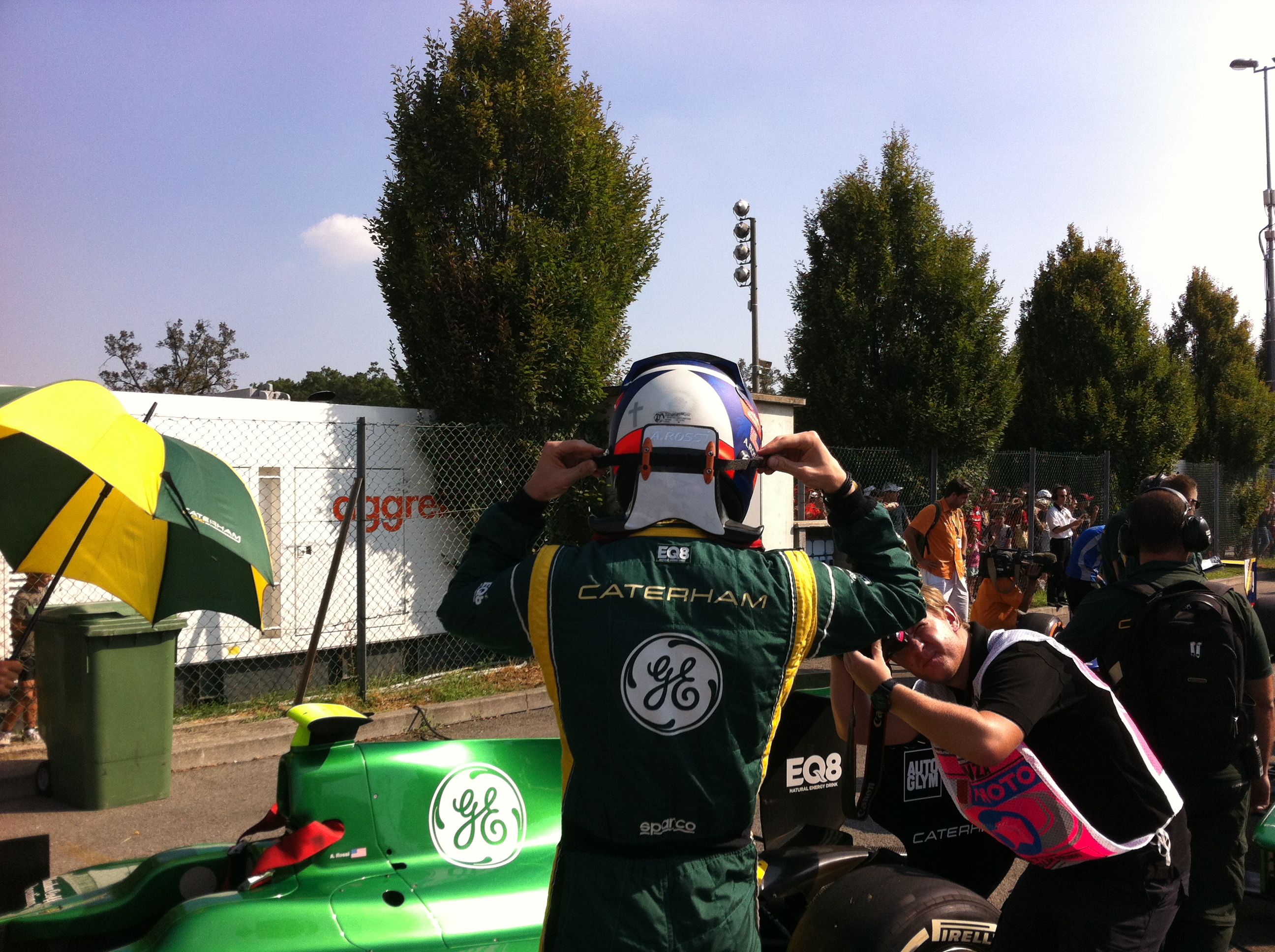 Helmet on and HANS device been strapped in, Caterham Racing driver Alexander Rossi prepares for last weekend’s GP2 Series Feature Race at Monza.