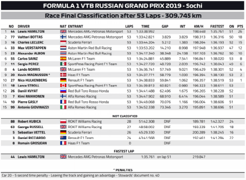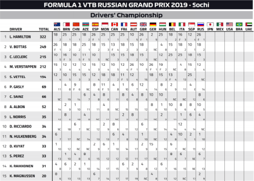 Hamilton hasn’t won the title yet, but he may as well have. His fourth win at Sochi means a 73-point gap to Bottas in the standings, with just 125 points left to play for. As the field disassembles and prepares for the Japanese Grand Prix in two weeks, Leclerc now sits some 34 points behind Bottas.